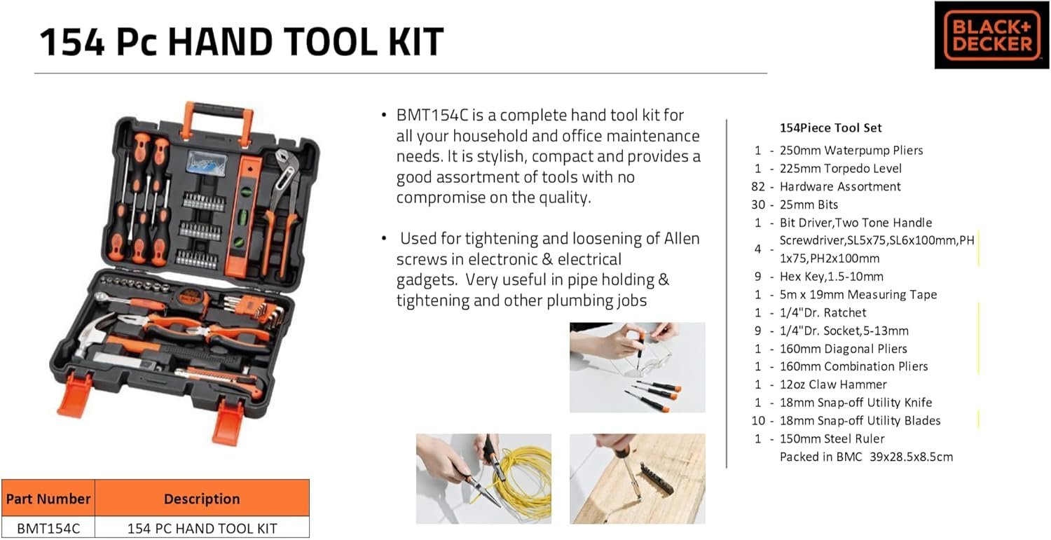 - BLACK+DECKER a pioneer in designing and manufacturing power and hand tools has come with a the best DIY tool kit for you. BLACK+DECKER BMT154C is a complete hand tool kit for all your household and office maintenance needs. It is stylish, compact and provides a good assortment of tools with no compromise on the quality.