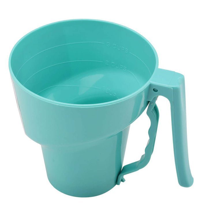 One-handed Flour Sifter Plastic Sieve Cup Screen Mesh Powder Flour Sieve.Uses a simple squeeze activated handle to sift your powder baking ingredients. leaving one hand completely free. And the inside of Sifter wiith measurement. The simple squeeze action easily breaks up clumps and aerates ingredients. without the aggressive cranking and shaking that most sifters need.